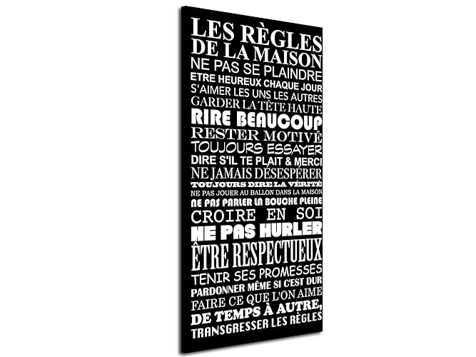DECLINA Tableau Deco Citation Les règles de la Maison - Impression Citation sur toile décoration murale - Déco maison, cuisine, salon, chambre adulte - Noir et Blanc 100x50 cm